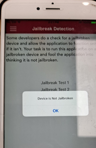 그런 다음 jailbreak test3 탭을 누르면 팝업 창에 Device is Not Jailbroken이란 메시지가 뜨면서 탈옥탐지를 우회할 수 있었다.