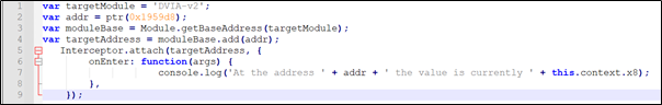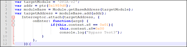 다음으로 메모리 주소를 가로 채고, x0 레지스터의 값이 0x01인지 확인한 후, 만약 그것이, 다음 0x0으로 변경되면 콘솔을 통해 “Bypass Test3”이라고 출력할 것이다.