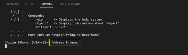 frida -U -l checkmeminuse.js DVIA-v2 명령을 실행 시킨 후, Jailbreak Test 3탭을 누르면 메모리 주소가 사용 중이라는 것을 알 수 있었다. (아이폰 화면에 Jailbreak Test3 버튼을 눌러도 동작하지 않음)