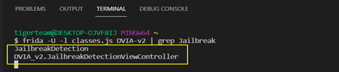 frida -U -l classes.js DVIA-v2 | grep Jailbreak