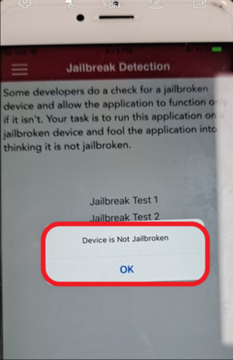 그런 다음 jailbreak test3 탭을 누르면 팝업 창에 Device is Not Jailbroken이란 메시지가 뜨면서 탈옥탐지를 우회할 수 있었다.