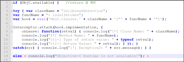 이 코드를 사용하면 클래스, 메서드 및 반환 할 새 값을 정의해야 한다. 앞에서 0x1을 봤기 때문에, 부울의 반대는 0x0일 것이다. 따라서 반환 값(newretval)은 0x0 으로 지정될 것이다.